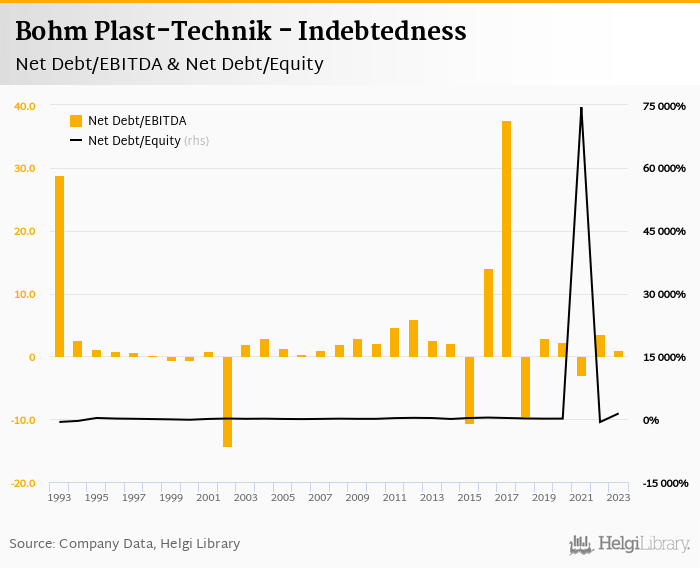Bohm Plast-Technik's net debt stood at CZK 33.6 mil and accounted for 1,365% of equity at the end of 2023. The ratio is up 2,055 pp compared to the previous year.