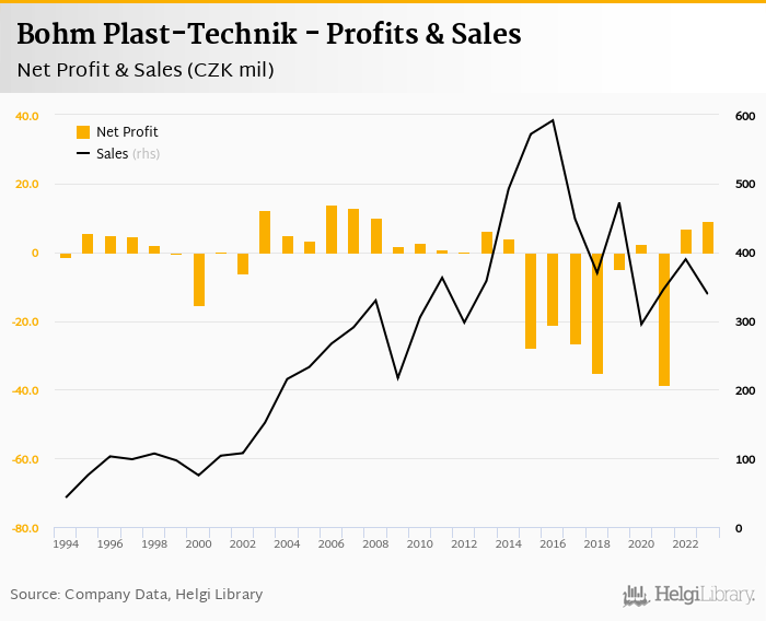 Bohm Plast-Technik made a net profit of CZK 9.23 mil in 2023, up 34.4% compared to the previous year. Total sales reached CZK 339 mil, which is down 13.1% when compared to the previous year.