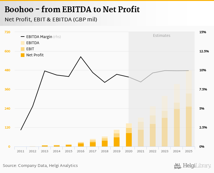 Boohoo made a net profit of GBP 87.1 mil with revenues of GBP 1,616 mil in 2020, up by 44.5% and up by 42.9%, respectively, compared to the previous year. This translates into a net margin of 5.39%.