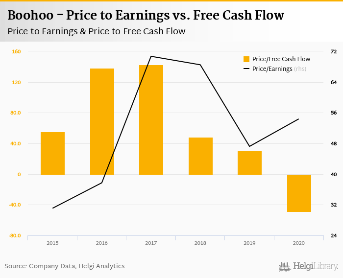 Regarding cash generated defined by the sum of net profit and depreciation, the stock traded at 32.6x at the end of 2020. When investments are excluded to get free cash flow, Boohoo traded at -48.6x.
