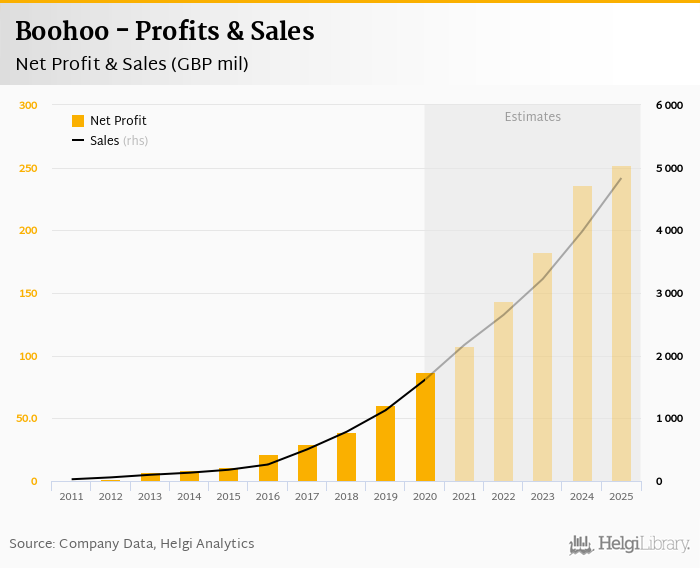 Boohoo made a net profit of GBP 87.1 mil in 2020, up 44.5% compared to the previous year. Total sales reached GBP 1,616 mil, which is up 42.9% when compared to the previous year.