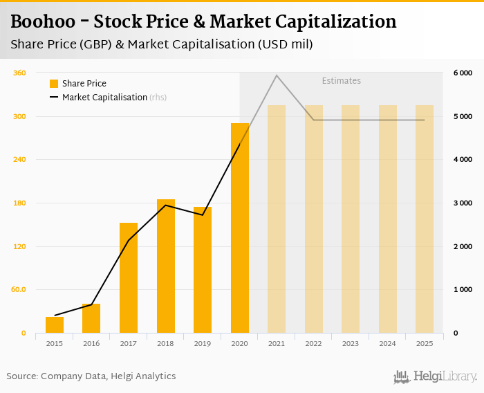 Boohoo stock traded at GBP 291 per share at the end 2020 implying a market capitalization of USD 4,337 mil.