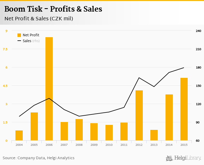 Boom Tisk made a net profit of CZK 5.14 mil in 2015, up 35.8% compared to the previous year. Total sales reached CZK 179 mil, which is up 4.63% when compared to the previous year.