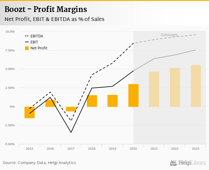 Boozt made a net profit of SEK 133 mil with revenues of SEK 4,385 mil in 2020, up by 142% and up by 28.0%, respectively, compared to the previous year.