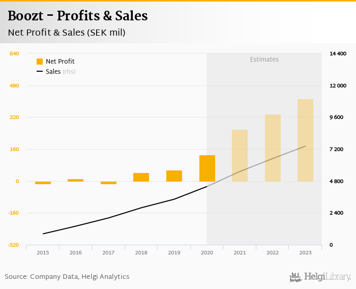 Boozt made a net profit of SEK 133 mil in 2020, up 142% compared to the previous year. Total sales reached SEK 4,385 mil, which is up 28% when compared to the previous year.