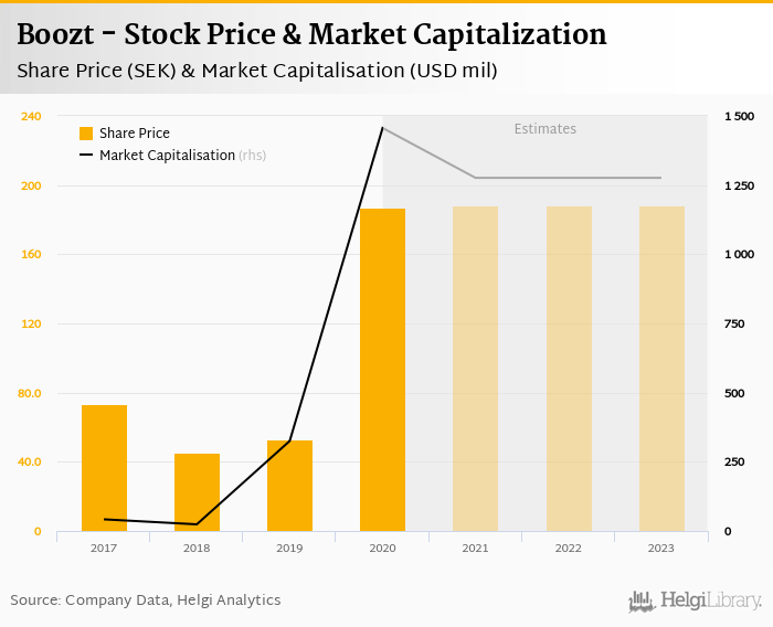 Boozt stock traded at SEK 187 per share at the end 2020 implying a market capitalization of USD 1,456 mil.