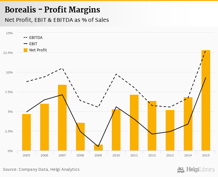 Borealis made a net profit of EUR 988 mil with revenues of EUR 7,700 mil in 2015, up by 73.3% and down by 7.56%, respectively, compared to the previous year.