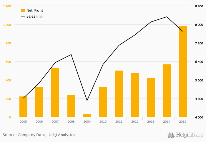 Historically, between 2005 and 2015, the company’s net profit reached a high of EUR 988 mil in 2015 and a low of EUR 38.0 mil in 2009. Over the last decade the firm's net profit increased by an average of 15.9% a year.
