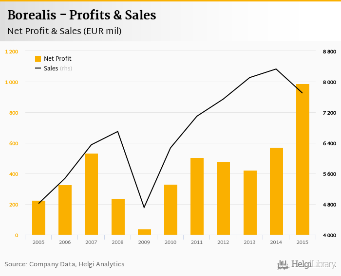 Borealis made a net profit of EUR 988 mil in 2015, up 73.3% compared to the previous year. Total sales reached EUR 7,700 mil, which is down 7.56% when compared to the previous year.