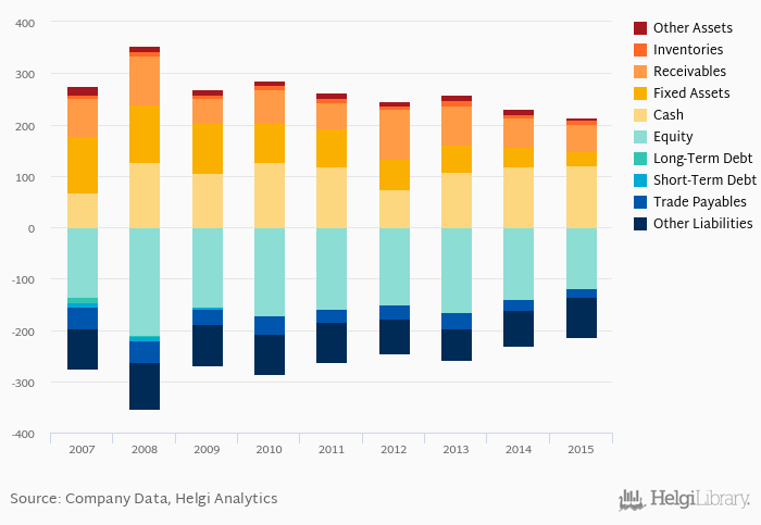 Net debt against equity is down 0.266 pp from five years ago (-0.740). The ratio against EBITDA decreased from -2.61x seen in 2010 to -3.21x.