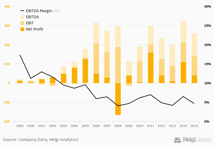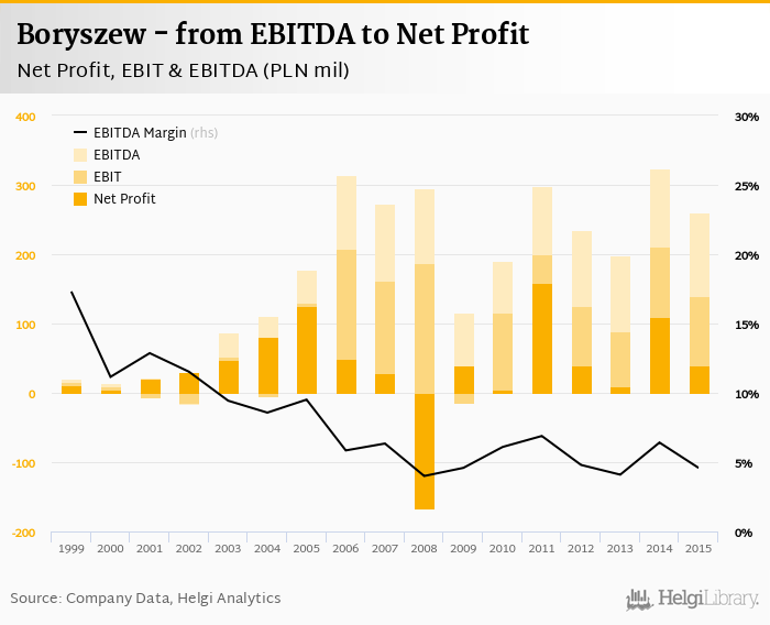 Boryszew made a net profit of PLN 40.0 mil with revenues of PLN 5,678 mil in 2015, down by 63.6% and up by 12.3%, respectively, compared to the previous year. This translates into a net margin of 0.705%.