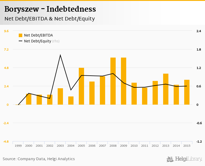 Boryszew's net debt stood at PLN 842 mil and accounted for 0.595 of equity at the end of 2015. The ratio is up 0.013 pp compared to the previous year.