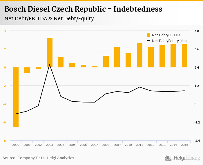 Bosch Diesel Czech Republic's net debt stood at CZK 4,372 mil and accounted for 0.852 of equity at the end of 2015. The ratio is up 0.049 pp compared to the previous year.