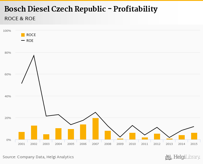 As far as Bosch Diesel Czech Republic's peers are concerned, Varroc Lighting Systems Czech Republic generated ROE of 28.0% and ROCE of 17.8% in 2015. Automotive Lighting's profitability reached 46.9% and 47.7%, respectively. Continental Automotive Czech Republic operated with 7.08% and 2.02% returns in 2015.