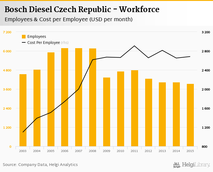Bosch Diesel Czech Republic employed 3,939 employees in 2015, down 2.31% compared to the previous year. Historically, between 2003 and 2015, the firm's workforce hit a high of 6,185 employees in 2006 and a low of 3,939 employees in 2015.