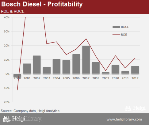 When exporting 98% of its production, Bosch has been hit hard by the financial crisis. In 2012, sales were still 25% off the peak in 2007. In terms of profitability, the 2012 numbers represent 18% of the 2007 level.