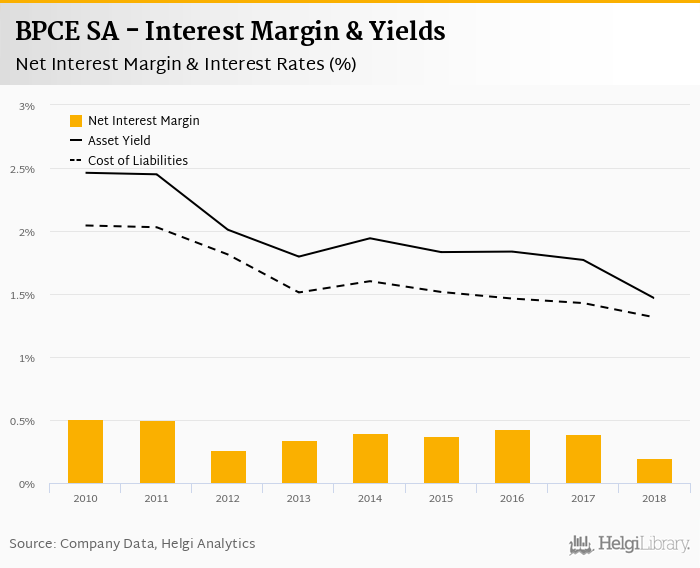 BPCE SA's net interest margin amounted to 0.197% in 2018, down from 0.392% compared to the previous year.