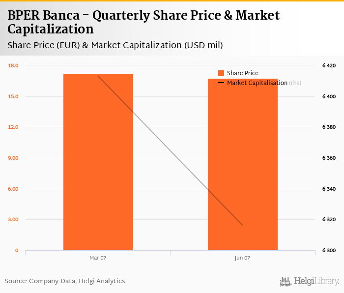 BPER Banca stock traded at EUR 16.7 per share at the end of second quarter of 2007 implying a market capitalization of USD 6,316 mil.