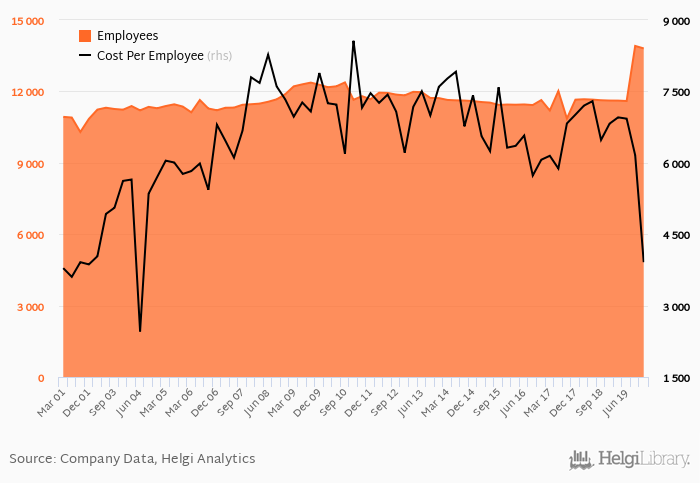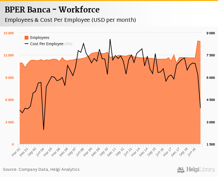 BPER Banca employed 13,805 persons in 2019-12-31, down 0.755% when compared to the previous year. Historically, the bank's workforce hit an all time high of 13,910 persons in 2019-09-30 and an all time low of 10,294 in 2001-09-30.