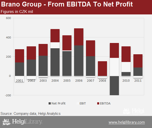 Despite still being 12% off the peak in 2007, sales has been growing in the last three years. In 2011, they reached nearly CZK 3.7 bil. Net profit amounted to CZK 88 mil in 2011, which is 36% below the average seen in the last decade