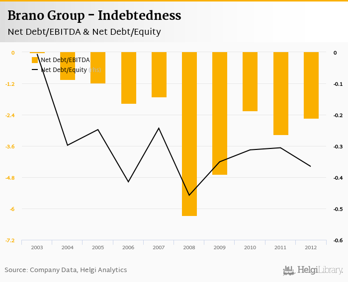 Brano Group's net debt stood at CZK -799 mil and accounted for -0.366 of equity at the end of 2012. The ratio is down 0.060 pp compared to the previous year.