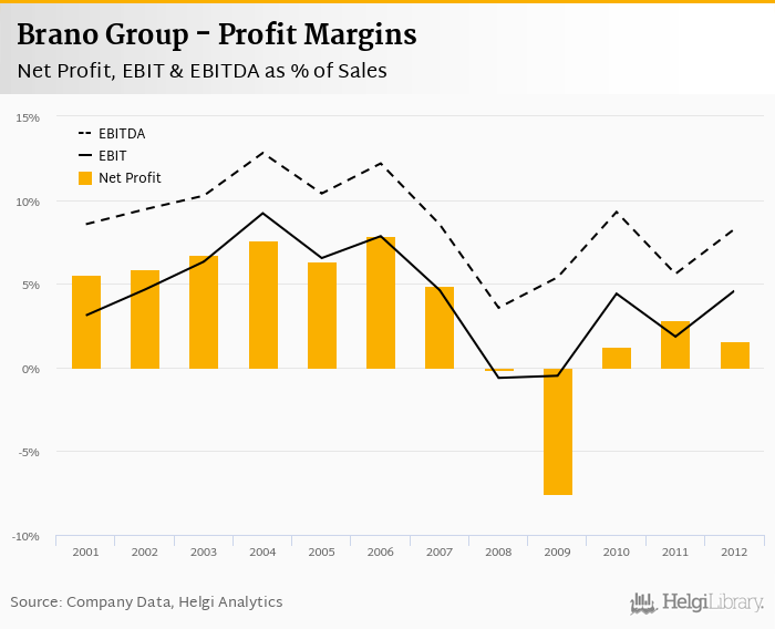 Brano Group made a net profit of CZK 60.5 mil with revenues of CZK 3,804 mil in 2012, down by 41.4% and up by 3.75%, respectively, compared to the previous year.
