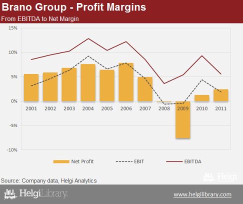 Despite still being 12% off the peak in 2007, sales has been growing in the last three years. In 2011, they reached nearly CZK 3.7 bil. Net profit amounted to CZK 88 mil in 2011, which is 36% below the average seen in the last decade