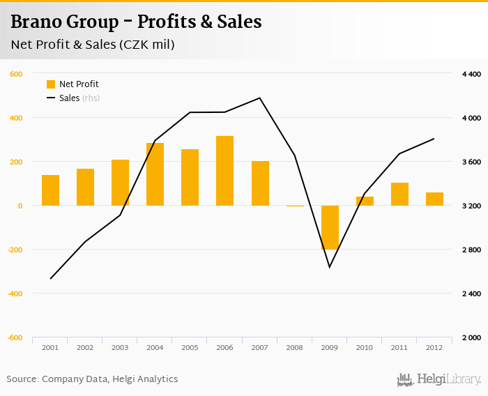 Brano Group made a net profit of CZK 60.5 mil in 2012, down 41.4% compared to the previous year. Total sales reached CZK 3,804 mil, which is up 3.75% when compared to the previous year.