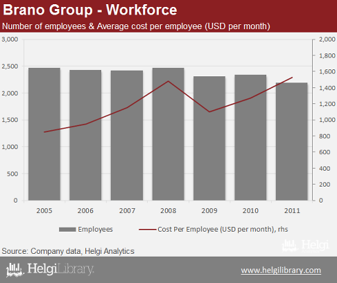 In 2011, the Company had 2,189 employees, which was some 11% lower than in 2008. Having said that, the average staff cost of USD 1,524 per employee in 2011 were some 79% higher than in 2005.