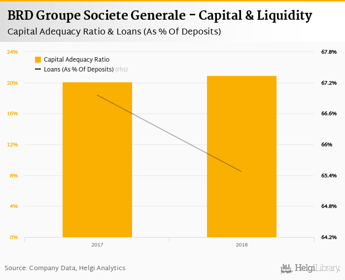 BRD Groupe Societe Generale's capital adequacy ratio reached 20.9% at the end of 2018, up from 20.1% compared to the previous year. Historically, the bank’s capital ratio hit an all time high of 20.9% in 2018 and an all time low of 20.1% in 2017.