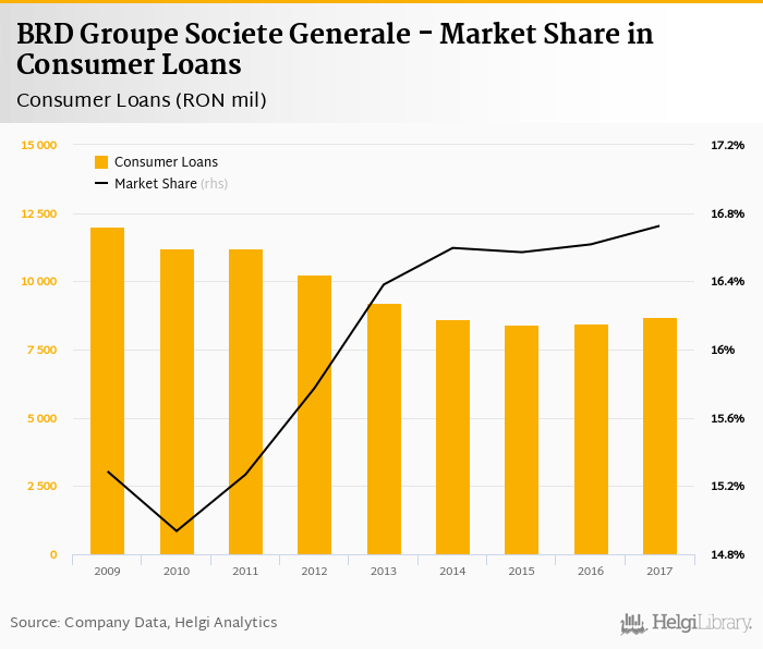 BRD Groupe Societe Generale accounted for 16.7% of all consumer loans issued in Romania at the end of 2017. Historically, the bank’s market share in consumer loans reached an all time high of 16.7% in 2017 and an all time low of 14.9% in 2010.