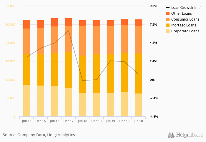 Mortgage loans represented 40.9% of the bank's loan book at the end of the year 2Q2020, consumer further 28.2% and corporate loans 24.0% of total loans.