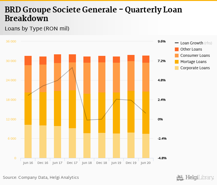 BRD Groupe Societe Generale's loans reached RON 31,702 mil in the second quarter of 2020, down from when compared to the previous quarter and up from RON 31,434 mil when compared to the same period of last year. Historically, the bank’s loans reached an all time high of RON 32,094 mil in 2Q2017 and an all time low of RON 31,359 mil in 2Q2018.