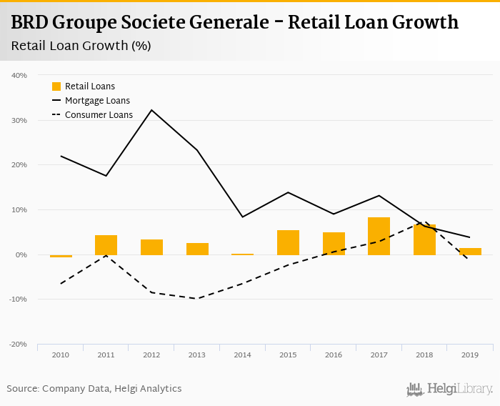 BRD Groupe Societe Generale's retail loans reached RON 22,073 mil at the end of 2019, up 1.50% compared to the previous year. In the last decade, the average annual loan growth amounted to 0%.