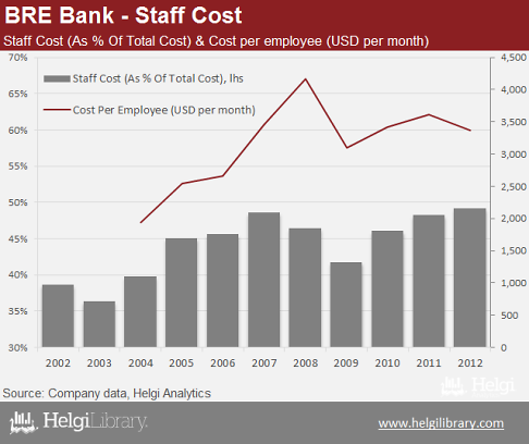 Staff cost formed nearly half of total operating cost of the BRE Group at the end of 2012, up from only 39% in 2001 when BRE was more a corporate-oriented bank.