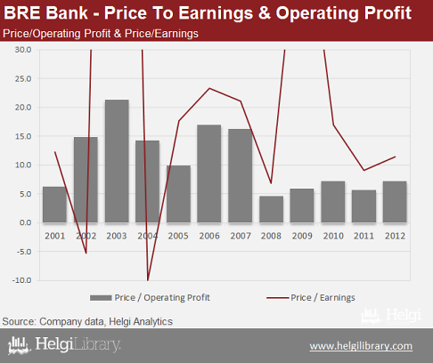 In the heydays of the year 2007, BRE share price traded at over 20x its earnings. Since then, the market corrected heavily. At the end of 2012, BRE bank traded at around 11x its annual net earnings