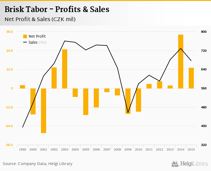 Brisk Tabor made a net profit of CZK 13.2 mil in 2015, down 61.6% compared to the previous year. Total sales reached CZK 676 mil, which is down 7.18% when compared to the previous year.