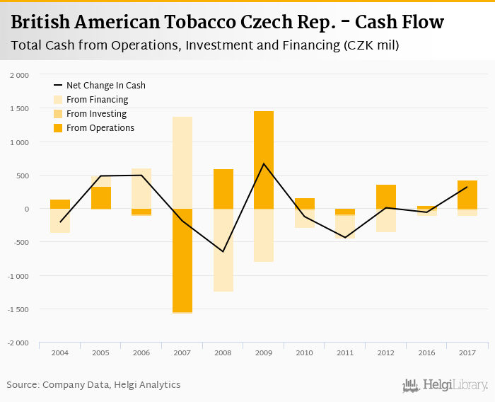Cash from financing amounted to CZK -90.3 mil, so the company generated CZK 319 mil net cash in 2017.