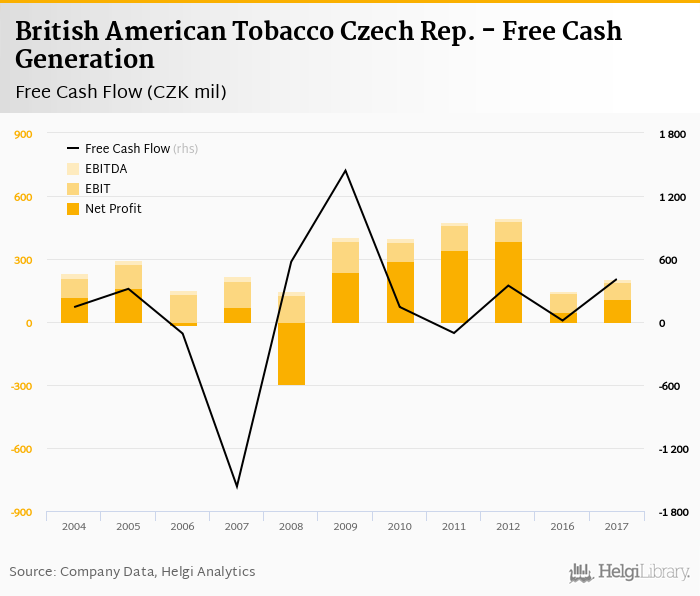 British American Tobacco Czech Rep. made a net profit of CZK 111 mil with revenues of CZK 14,923 mil in 2017, up by 124% and up by 10.4%, respectively, compared to the previous year. This translates into a net margin of 0.747%.