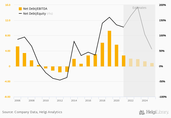 Historically, the firm’s net debt to equity reached a high of 160% in 2019 and a low of -45.6% in 2012 between 2006 and 2021. The average for the last five years was 120%.