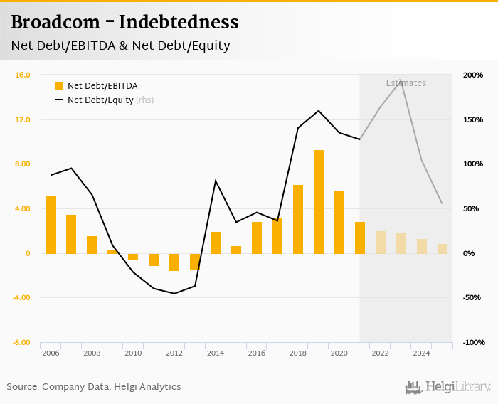 Broadcom's net debt stood at USD 29,286 mil and accounted for 127% of equity at the end of 2021. The ratio is down 7.56 pp compared to the previous year.