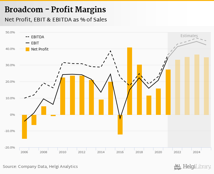 Broadcom made a net profit of USD 7,830 mil with revenues of USD 28,501 mil in 2021, up by 98.1% and up by 15.5%, respectively, compared to the previous year.