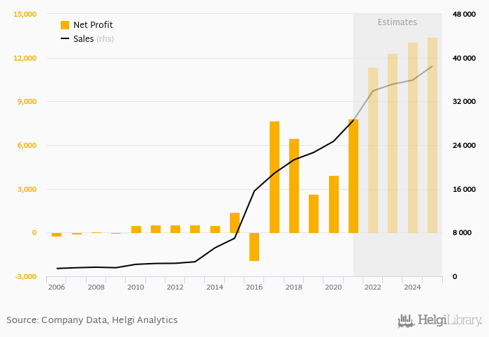 Sales have grown by 28.4% a year on average since 2011. They reached a high of USD 28,501 mil in 2021 and a low of USD 1,431 mil in 2006.