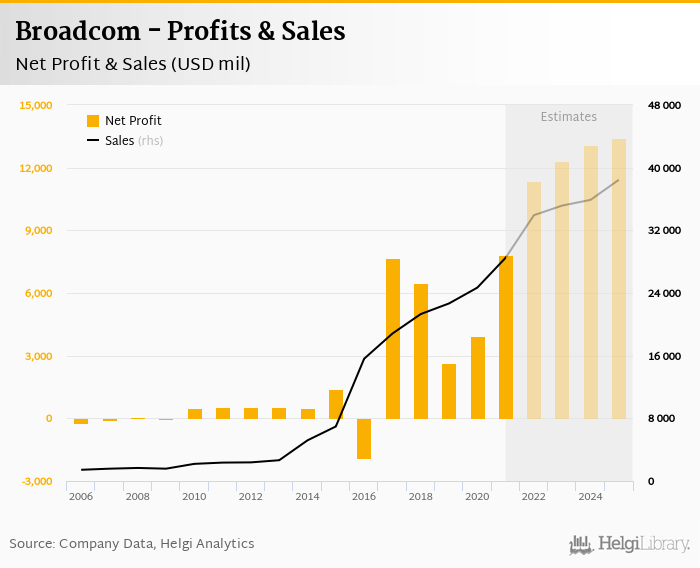 Broadcom made a net profit of USD 7,830 mil in 2021, up 98.1% compared to the previous year. Total sales reached USD 28,501 mil, which is up 15.5% when compared to the previous year.