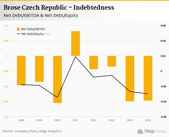 Brose Czech Republic's net debt stood at CZK -191 mil and accounted for -0.030 of equity at the end of 2015. The ratio is down 0.003 pp compared to the previous year.