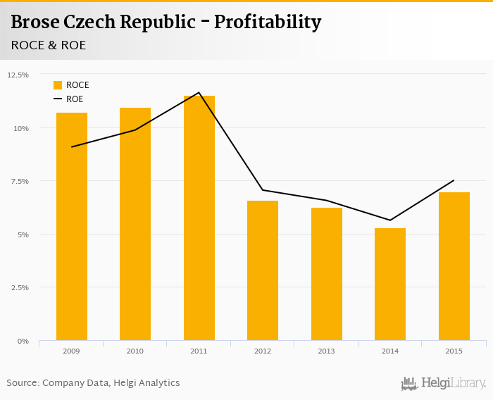 As far as Brose Czech Republic's peers are concerned, Varroc Lighting Systems Czech Republic generated ROE of 28.0% and ROCE of 17.8% in 2015. Automotive Lighting's profitability reached 46.9% and 47.7%, respectively. Continental Automotive Czech Republic operated with 7.08% and 2.02% returns in 2015.