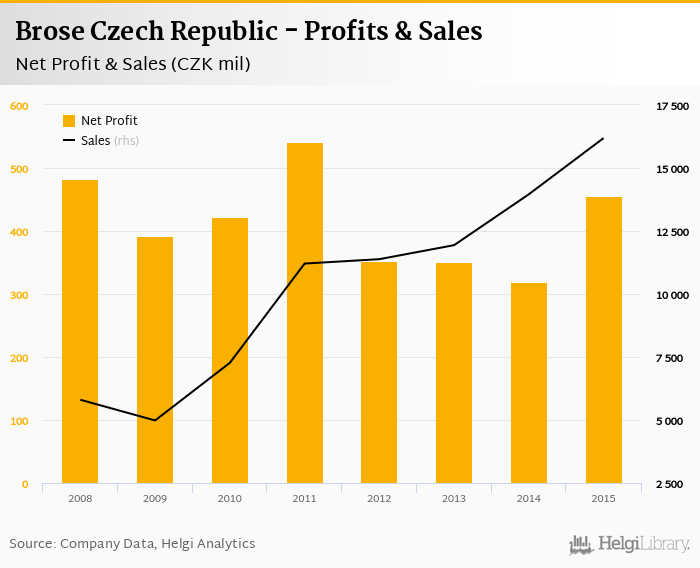 Brose Czech Republic made a net profit of CZK 456 mil in 2015, up 42.8% compared to the previous year. Total sales reached CZK 16,188 mil, which is up 16% when compared to the previous year.