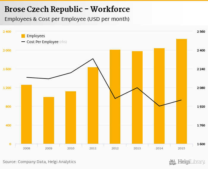 Brose Czech Republic employed 2,241 employees in 2015, up 9.58% compared to the previous year. Historically, between 2008 and 2015, the firm's workforce hit a high of 2,241 employees in 2015 and a low of 1,006 employees in 2009.