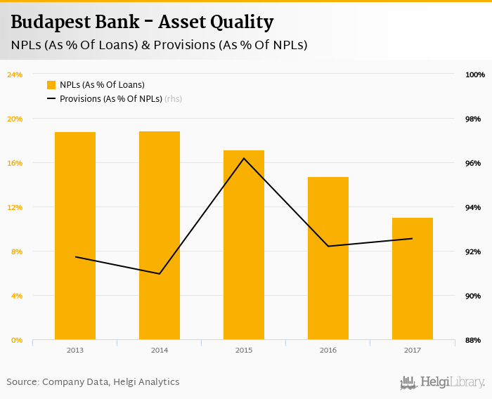 Budapest Bank's non-performing loans reached 11.0% of total loans at the end of 2017, down from 14.7% compared to the previous year. Historically, the NPL ratio hit an all time high of 18.9% in 2014 and an all time low of 11.0% in 2017.