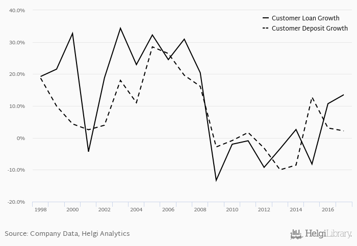 On the other hand, bank's customer deposit growth amounted to 2.18% at the end of 2017, down from 3.09% when compared to the previous year. Historically, the bank’s deposit growth reached an all time high of 28.5% in 2005 and an all time low of -10.0% in 2013. In the last decade, the average annual loan growth amounted to 0.740%.